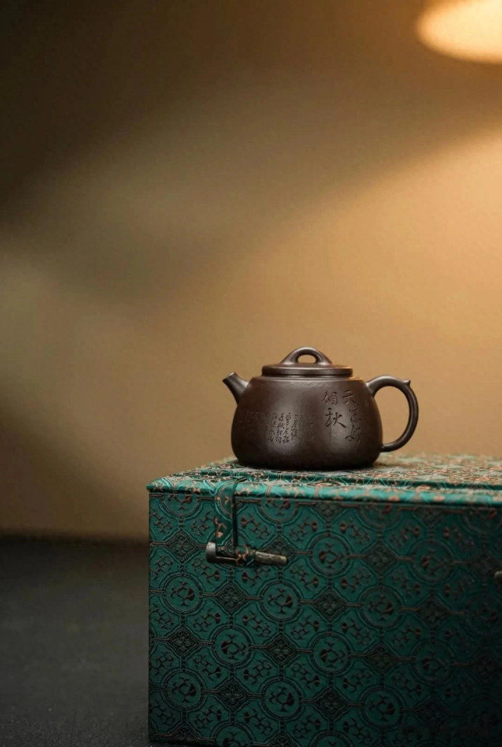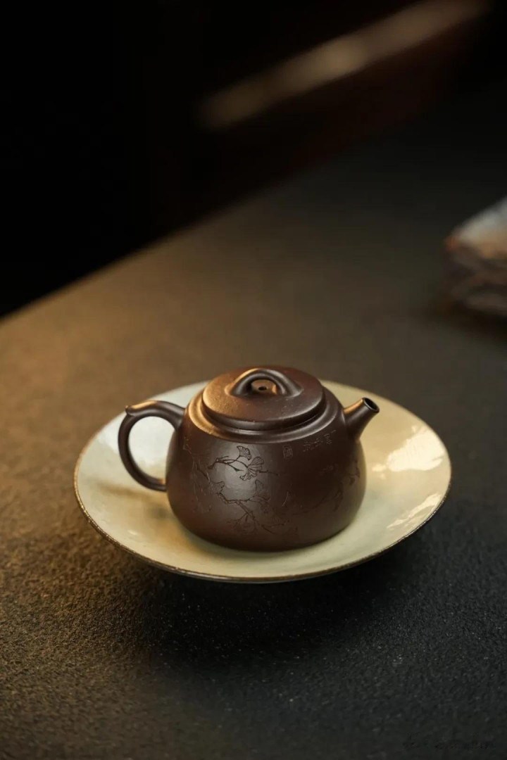 慕古经典,大气端庄,轻胚精工,委宛优雅,壶钮精细,精工刻绘银杏枝杈和诗文,把玩出彩