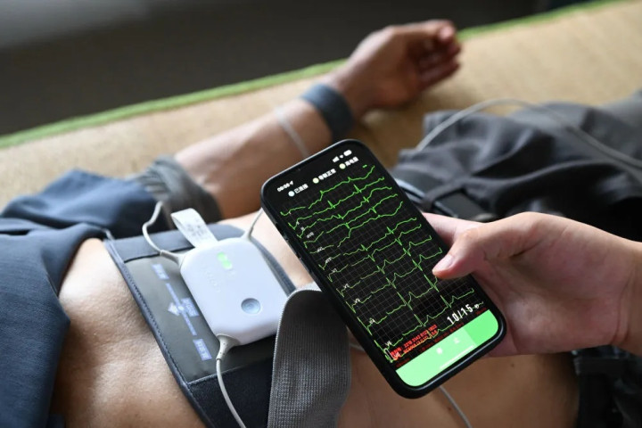 在江苏省海安市曲塘镇刘圩村卫生室,医生为村民进行心电图检查。新华社记者季春鹏摄