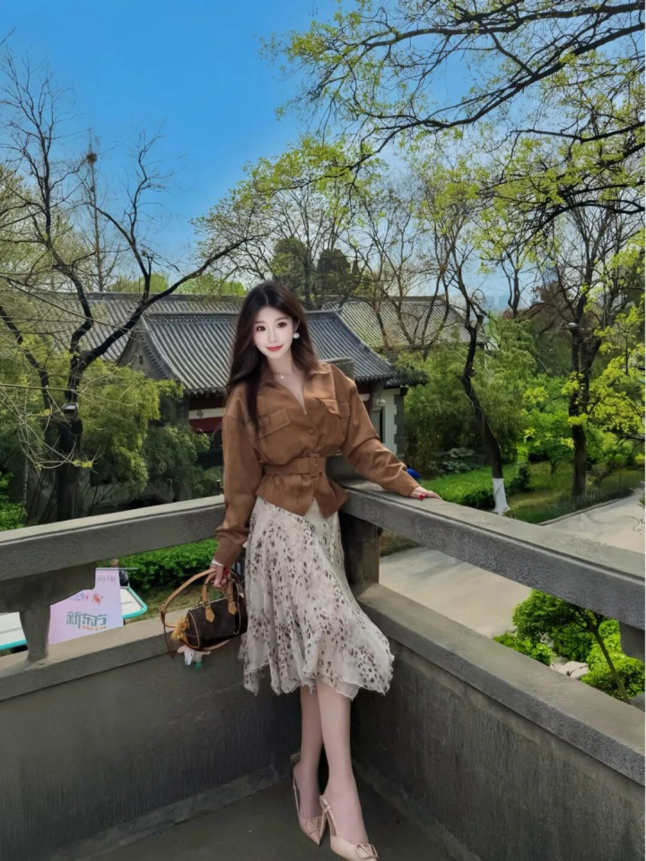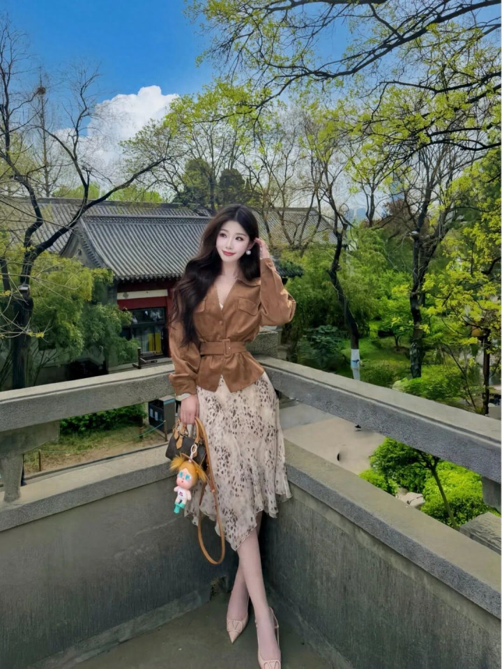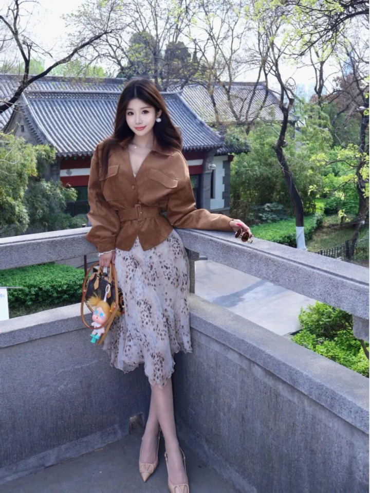 买球平台 驼色绒面外衣+豹纹裙, 相沿斯文的个性前锋魔力
