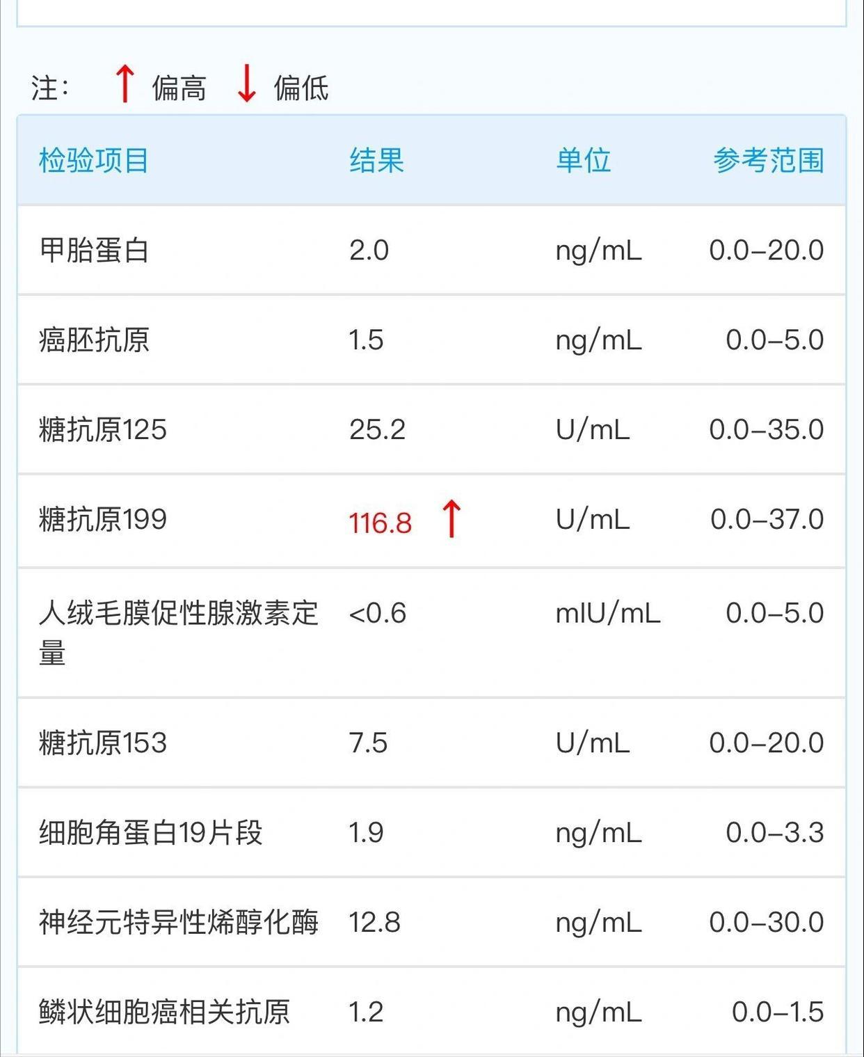 轻度升高(37-100U/ml) :单次检测轻度升高,多见于良性疾病,如急性胰腺炎、胆囊炎、胆管结石等。胰腺癌患者很少在这个边界内永恒停留。