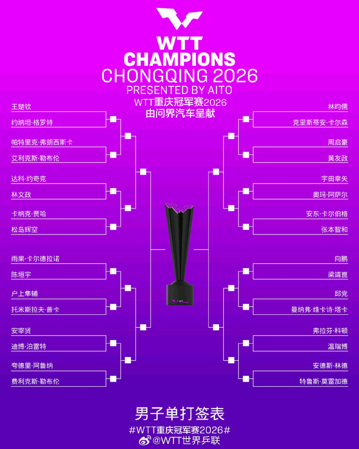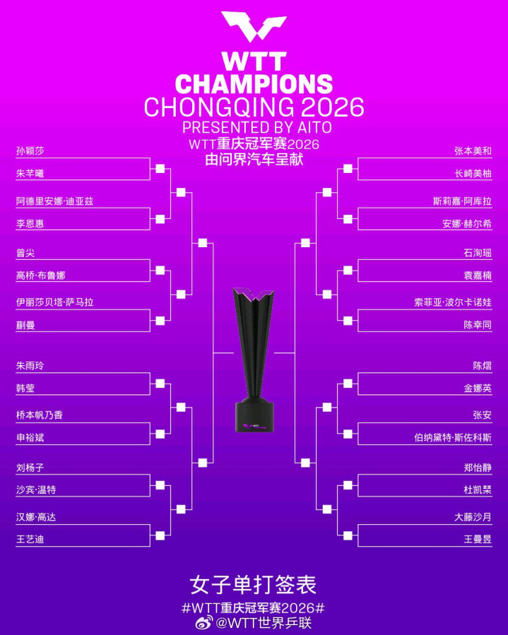 2026wtt重庆冠军赛3月10日开打。男女单32强赛将在3月10日至12日进行。王曼昱等10日亮相。王楚钦等11日亮相。孙颖莎等12日出场。