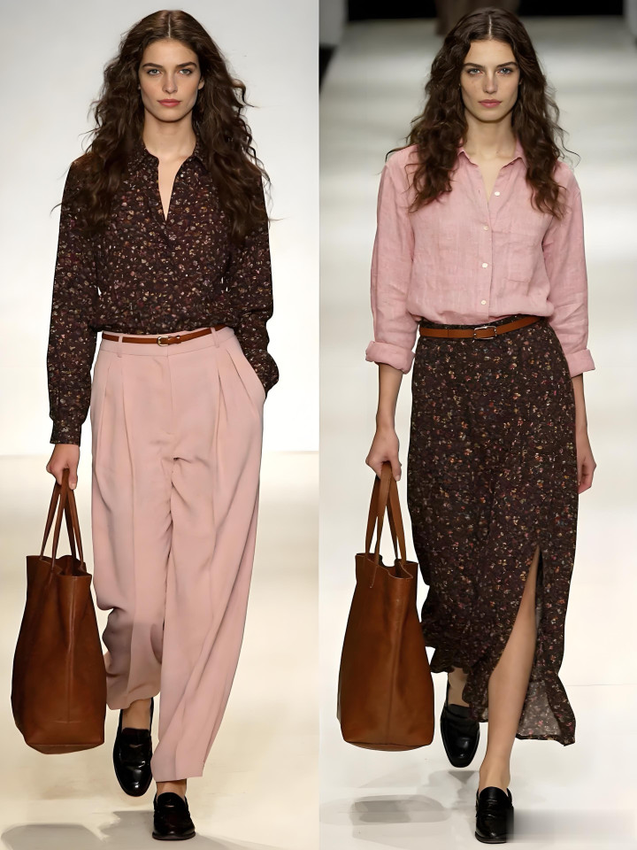组织造型用柔粉+深棕和深棕碎花+柔粉两组配色,展现了善良穿搭的两种可能,繁简集中,维捏又善良,两种配色齐属于低充足度的色系,显白又提气。