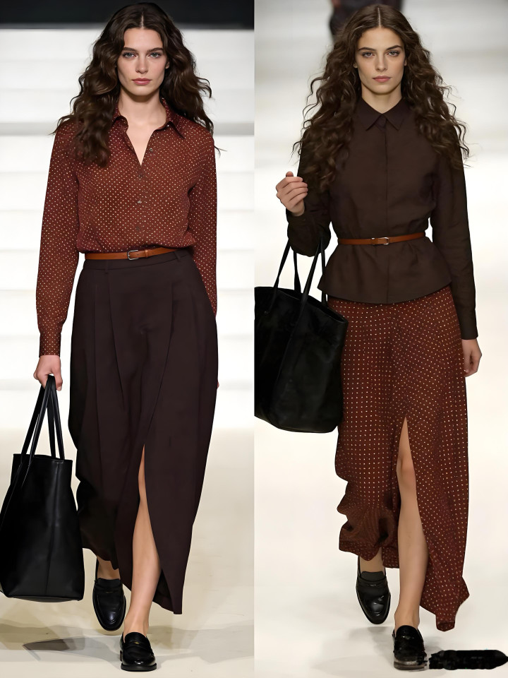 这组造型用深棕+波点,打造了维捏风穿搭,完好意思展现出维捏又优雅的气质,恣意的版型又不会显得刻板,安稳、自信,岁月从不败好意思东谈主。