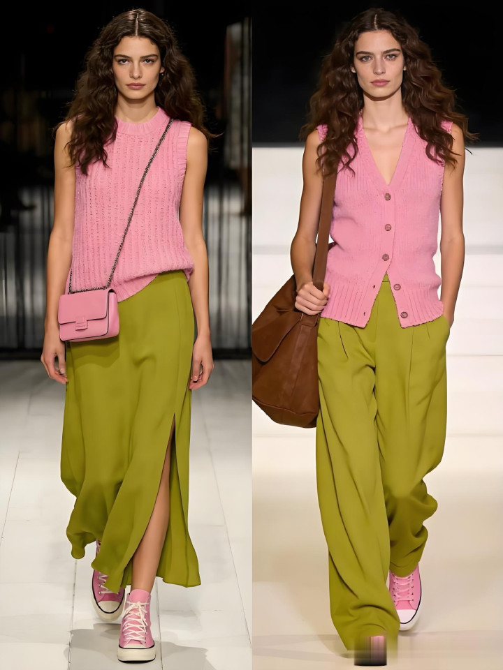 樱花粉+橄榄绿是一组充满春日气味的撞色,樱花粉的甜好意思善良,搭配橄榄绿的极新千里稳,甜而不腻、嫩而不妖,完好意思均衡了仙女感与纯属感。