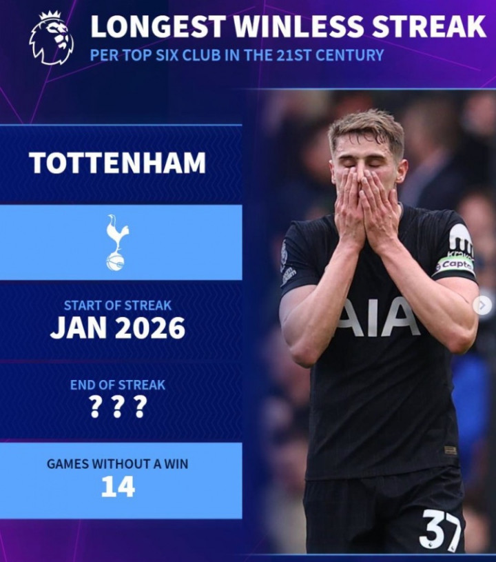 直播吧4月18日讯热刺将在本轮英超主场迎战布莱顿,能否闭幕14轮不堪值得眷注。《转会市集》统计显现,买球投注平台热刺刻下仍是追平了BIG6新世纪在英超的最长不堪记录。