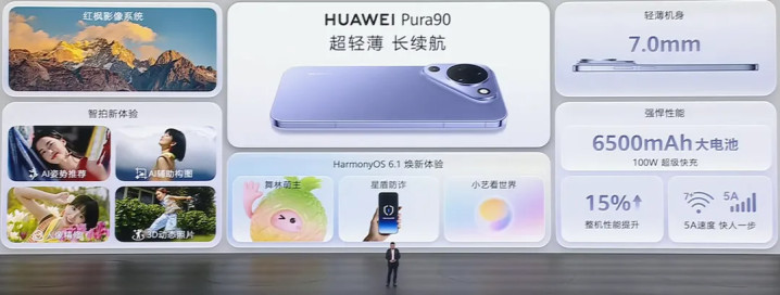 Pura90此次在外不雅诡计上最大的变化是相机deco变了,有罗兰紫、丝绒黑、雪域白三种配色。整机电板为6500mAh 7.0mm的厚度,性能提高15%。影像建立上:后置1250万像素超广角录像头、5000万像素超聚光主摄、5000万像素超聚光潜望长焦,前置5000万像素超聚光东谈主像录像头,同期前后齐带红枫原色录像头。