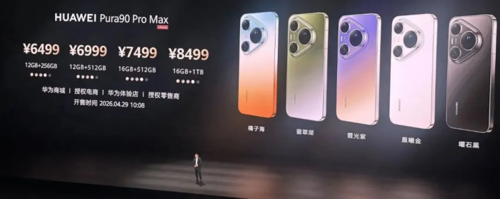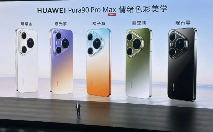 华为Pura90Pro Max就带来橘子海、翡翠湖、霞光紫、晨光金、曜石黑五款配色。