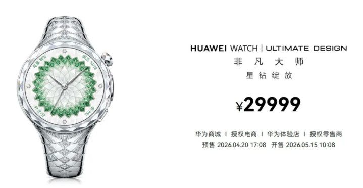 华为WATCHULTIMATE DESIGN 超卓专家 星钻开放款,甄选99颗自然钻石售价29999元。