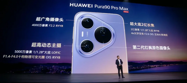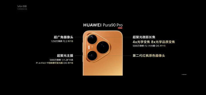 其中Pura90 Pro搭载1250万像素的超广角录像头,5000万像素超聚光主摄,5000万像素超聚光微距长焦,第二代红枫原色录像头。