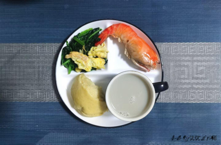 第三种:黑豆浆+菠菜炒鸡蛋+杂粮馍馍+大虾