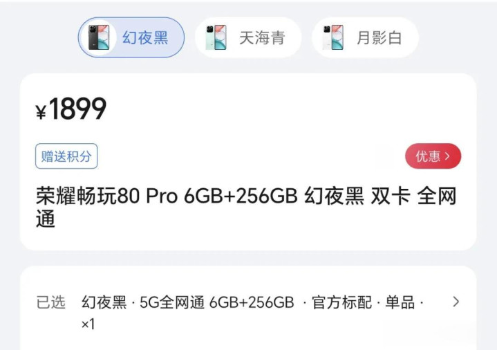 可是这存储成就和价钱就收支甚远了,这荣耀畅玩80Pro的存储挺有道理的,皆是256G,区别在于开动,起步价为6+256G售价1899元,这6G开动配256 ?惟恐除了iPhone也唯有荣耀了,8+256G售价2099元,12+256G售价2299元。